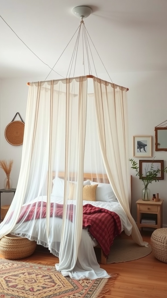 When it comes to creating a cozy boho bedroom, unique bed canopies play a key role. This particular style showcases a light, airy canopy that drapes elegantly around the bed. The soft fabric adds a layer of comfort and a touch of whimsy to the space.