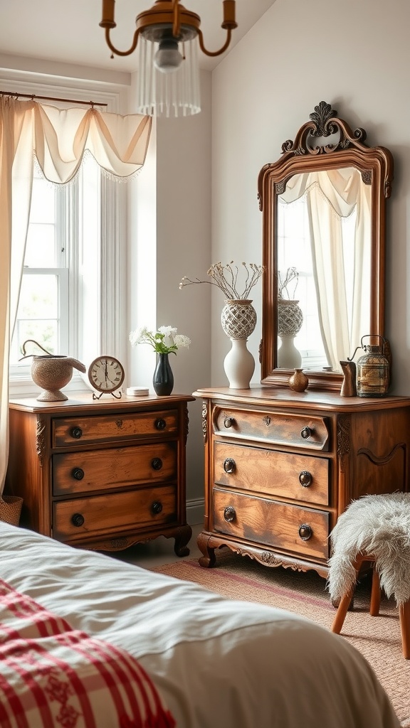 The large mirror above the dresser not only serves a practical purpose but also enhances the vintage vibe. Mirrors can make a space feel larger and reflect light, which is essential in creating a bright, airy feel in a boho setting. The ornate frame complements the dresser, tying the elements together.