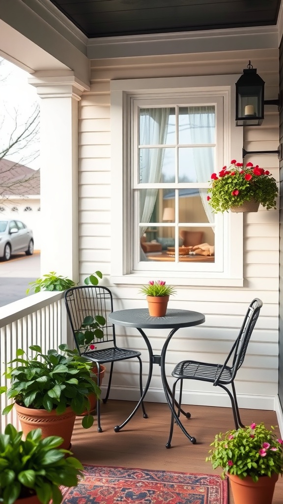 A bistro set can be a fantastic addition to your front porch, especially if space is tight. The image shows a charming setup with two black metal chairs and a round table. This setup is perfect for enjoying morning coffee or afternoon chats with friends.