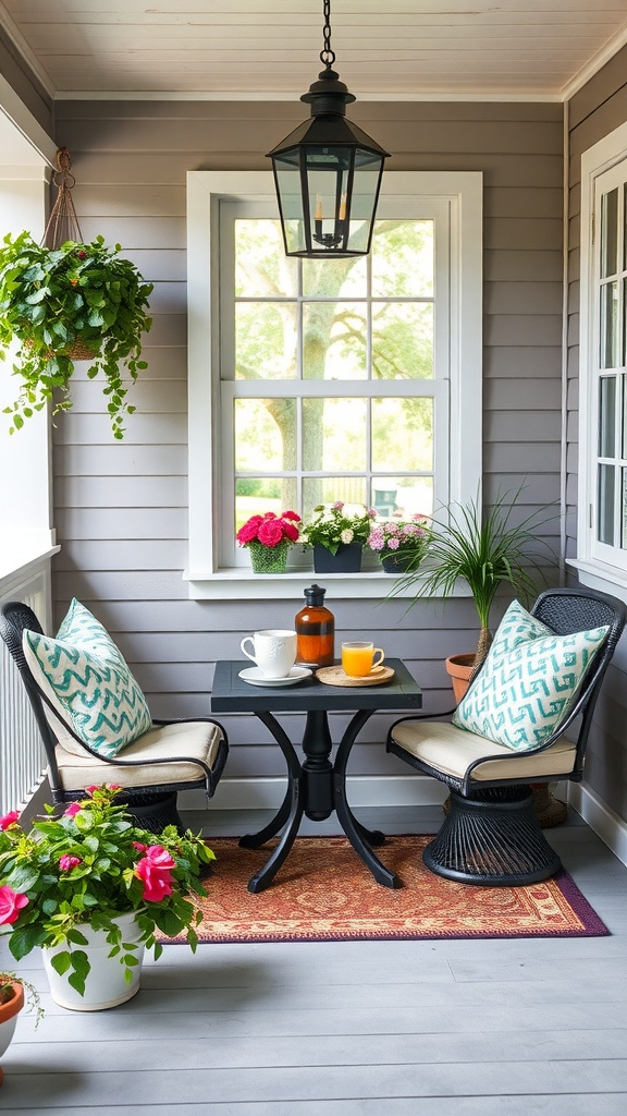 Your front porch can be the perfect spot for a coffee nook. Picture a cozy setup with two comfortable chairs and a small table. This arrangement invites you to relax with your favorite brew. The bright, cheerful pillows add a splash of color, making the space feel welcoming.
