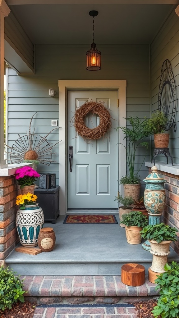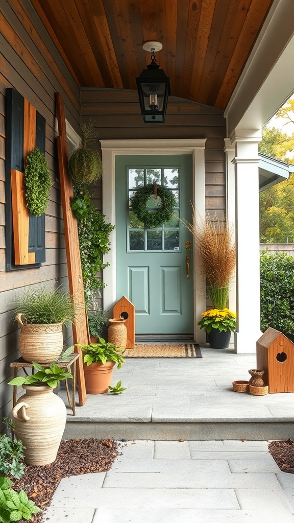 The focal point is the beautiful blue door, framed by greenery and decorative elements. A wreath adds a cozy touch, welcoming guests with a hint of nature. The mix of potted plants provides vibrant colors and textures, creating a soothing atmosphere. Notice the earthy planters and wooden accents that enhance the natural vibe.