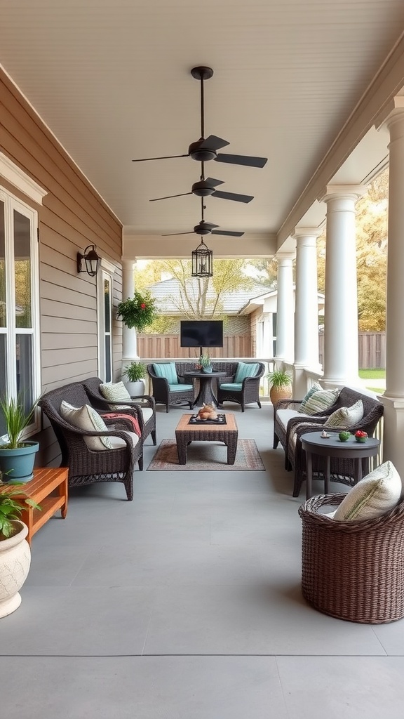 In the image, we see a spacious porch adorned with stylish furniture. The wicker chairs and tables create a relaxed vibe, perfect for family discussions. The plants add a touch of nature, making the area feel fresh and alive. The ceiling fan offers a cool breeze, making it comfortable even on warm days.
