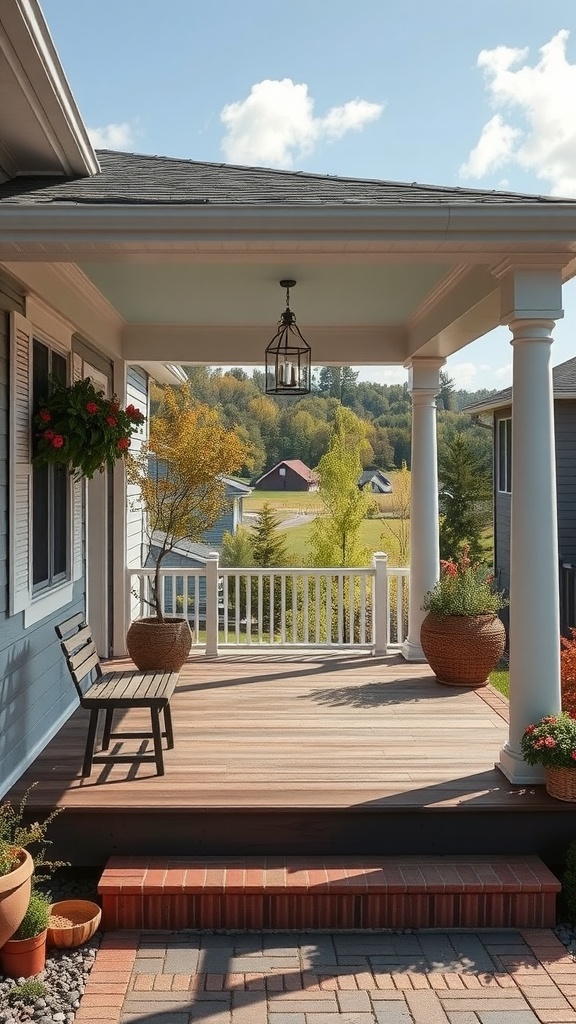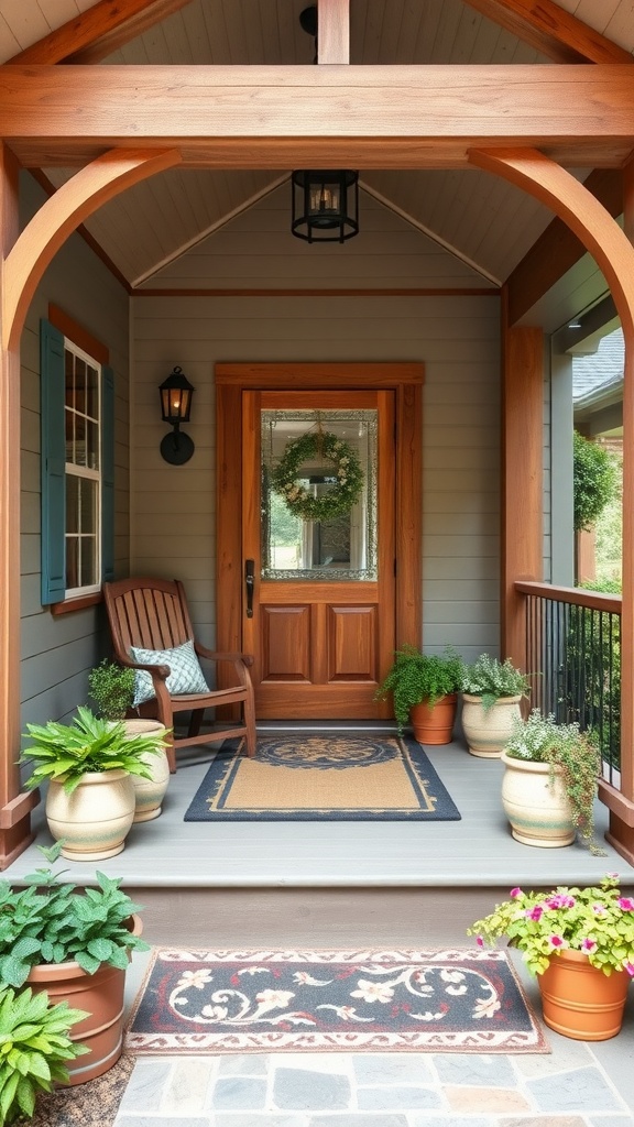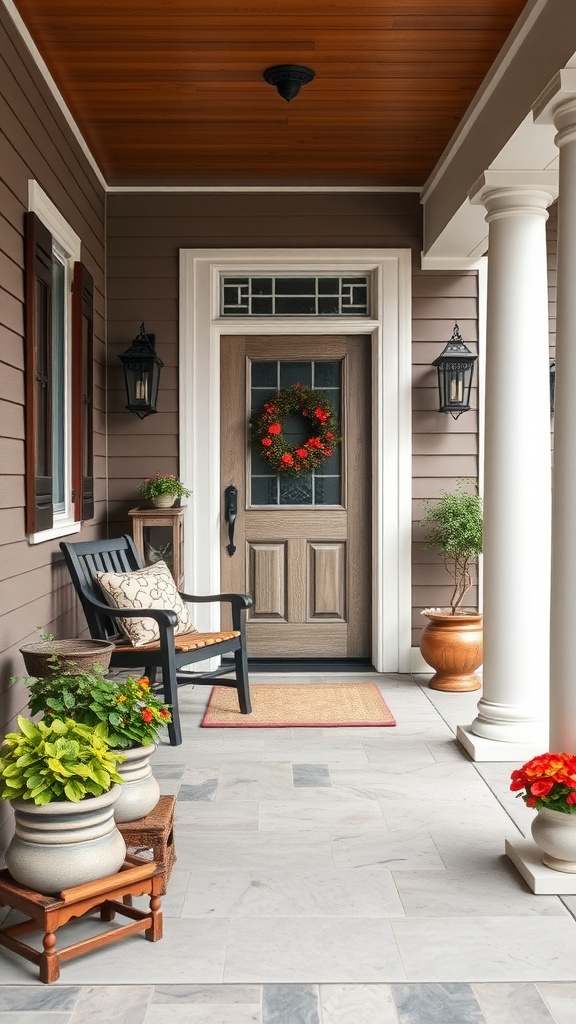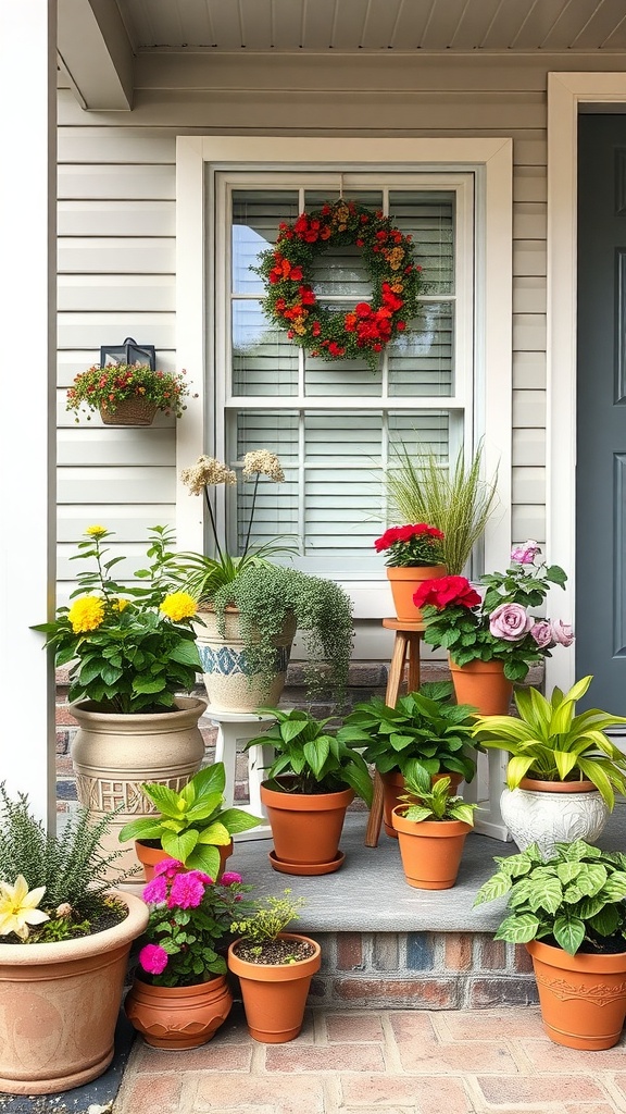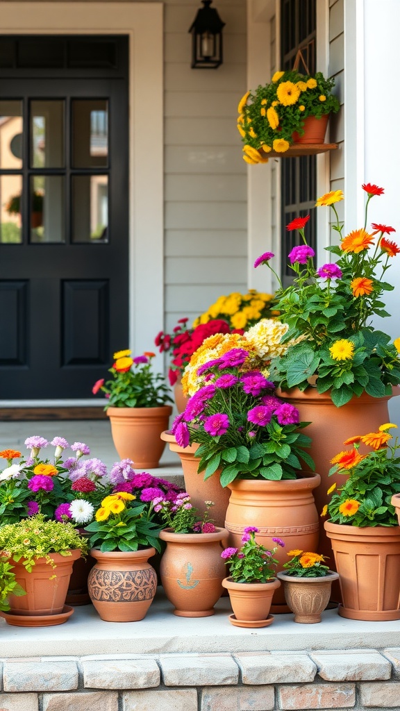 Terracotta pots are a fantastic way to add charm to your front porch. Their warm, earthy tones blend beautifully with vibrant flowers, creating a lovely welcome for guests. In the image, you can see a range of pots filled with colorful blooms, which instantly brighten up the space.