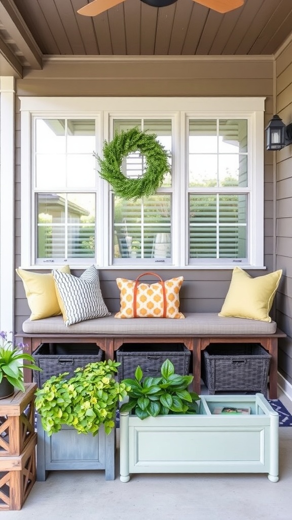 The baskets can hold various items, from gardening tools to outdoor games. They blend seamlessly with the overall aesthetic, making the porch feel inviting and tidy. You can even use decorative pots and planters to continue this theme, keeping your plants neatly arranged while enhancing the visual appeal.