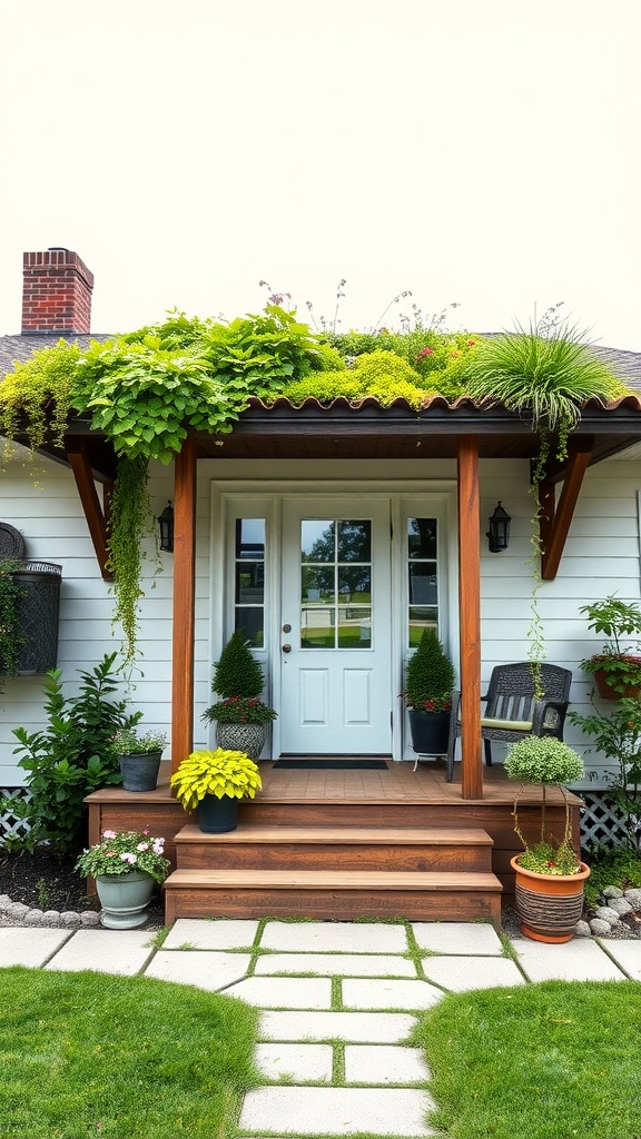 Imagine stepping onto a front porch that greets you with vibrant greenery. This image captures a charming house with a green roof, overflowing with lush plants. It’s a delightful sight that instantly brightens the space.
