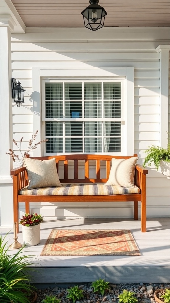 A welcome bench can really enhance your front porch. It serves as a perfect spot to relax and enjoy a cup of coffee or chat with neighbors. The image shows a lovely wooden bench with striped cushions, which adds a touch of warmth.