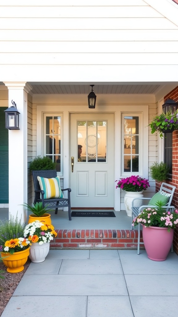 When it comes to sprucing up your front porch, colorful accents can make a huge difference. The image showcases a welcoming porch adorned with vibrant flowers in various pots, instantly bringing life to the space. Bright yellows, pinks, and whites create a cheerful atmosphere, making it a perfect spot to relax or greet guests.