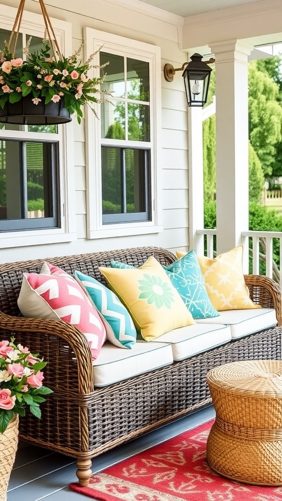 Outdoor pillows can really transform your front porch into a cozy retreat. In the image, a wicker sofa adorned with vibrant pillows creates an inviting atmosphere. The mix of colors and patterns adds personality and warmth.