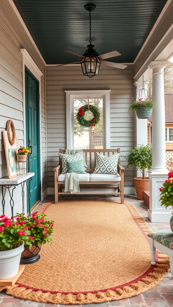 Pairing the rug with lovely potted plants and a beautiful wreath creates a cohesive and inviting atmosphere. The porch’s overall design reflects care and thoughtfulness, showing that a simple addition like a rug can transform a space into a welcoming entryway.
