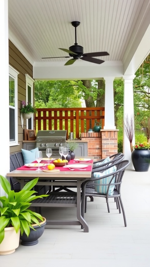 Consider adding some outdoor-friendly accessories like colorful dishware or a small herb garden nearby. A ceiling fan helps keep the area cool, ensuring your cooking sessions are comfortable even on warm days.
