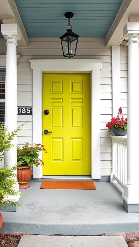 Choosing a bold color like yellow can make your front porch feel welcoming. It invites guests to step inside and experience what your home has to offer. The contrast of the yellow against the neutral siding enhances the overall look.