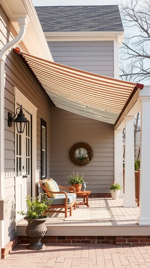 Awnings are a fantastic way to add both style and function to your front porch. They provide much-needed shade, making your outdoor space comfortable even on sunny days. The image shows a charming porch with a striped awning that not only looks appealing but also creates a cozy atmosphere.