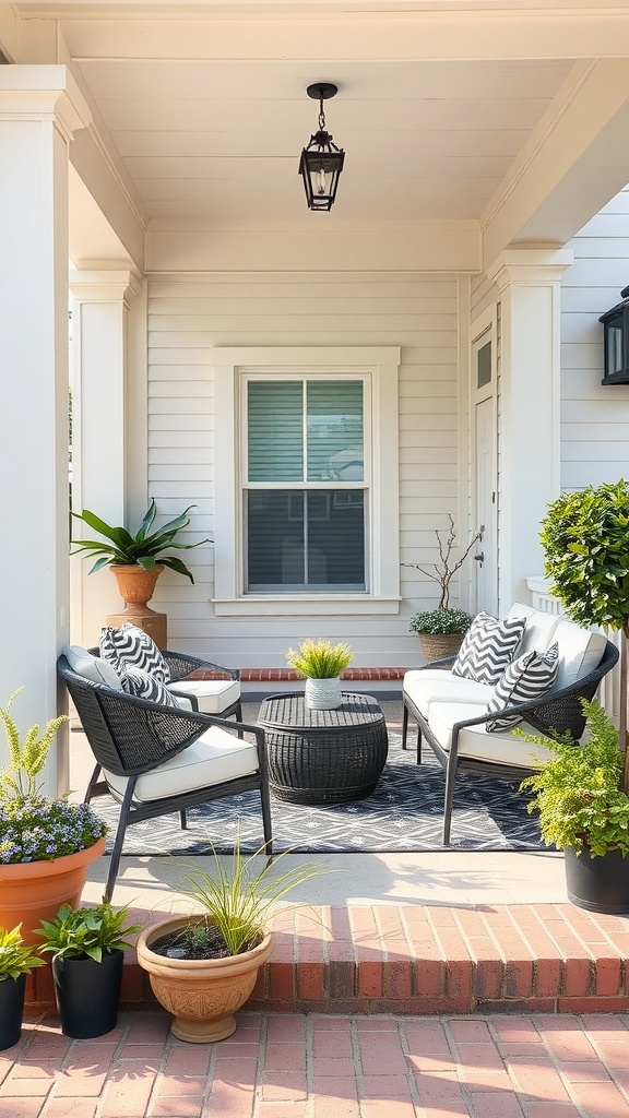 A front porch can be the perfect spot for relaxation, especially with stylish outdoor furniture. The image shows a cozy setup with comfortable seating that invites you to sit back and enjoy a cup of coffee.