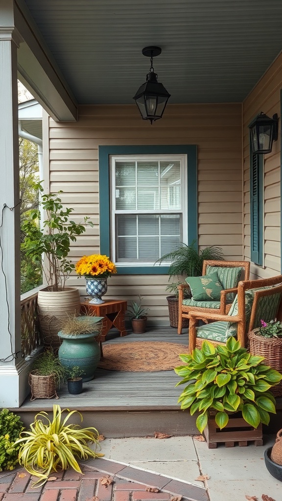 Consider incorporating similar elements on your porch. Use different heights for your plants to add depth. Layer textures by mixing ceramic pots with woven baskets. A few birdhouses can bring a playful touch while attracting local wildlife. This porch design encourages relaxation and connection with the outdoors, making it an ideal spot for morning coffee or evening chats.