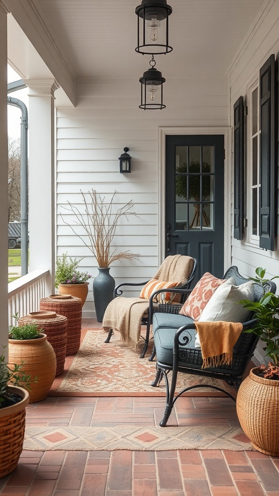 Your front porch can be both stylish and practical. The image shows a lovely setup that balances comfort and functionality. Notice the cozy seating area paired with some clever storage solutions. The use of wicker baskets is a great way to keep items organized while adding a charming touch to the decor.