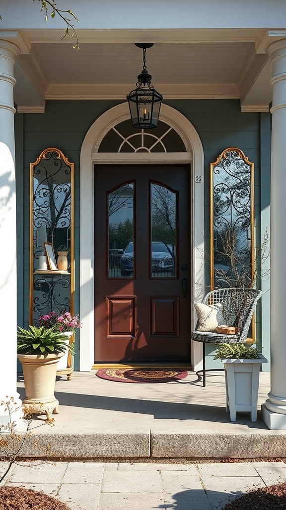 Mirrors can be a wonderful addition to your front porch. They create a sense of openness and make the space feel larger. In the image, you can see two elegant mirrors flanking the door, adding a stylish touch while reflecting light.