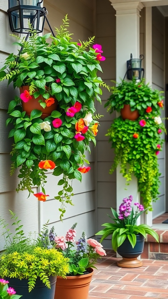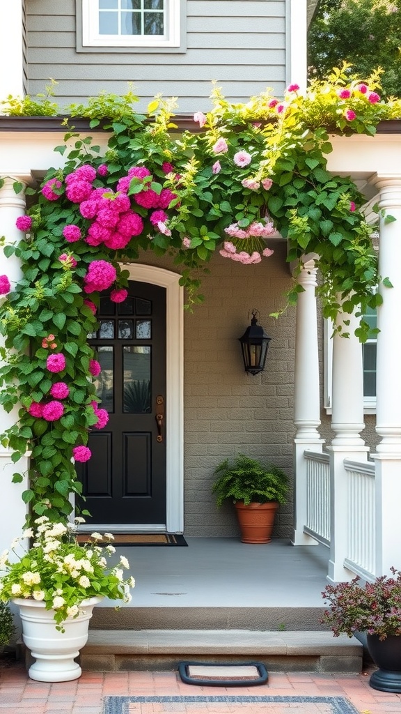 The vibrant pink flowers cascading from the hanging pots create a cheerful vibe. This simple touch can transform any entryway into a welcoming haven. The combination of different plants can provide a beautiful contrast, making the space feel richer and more dynamic.