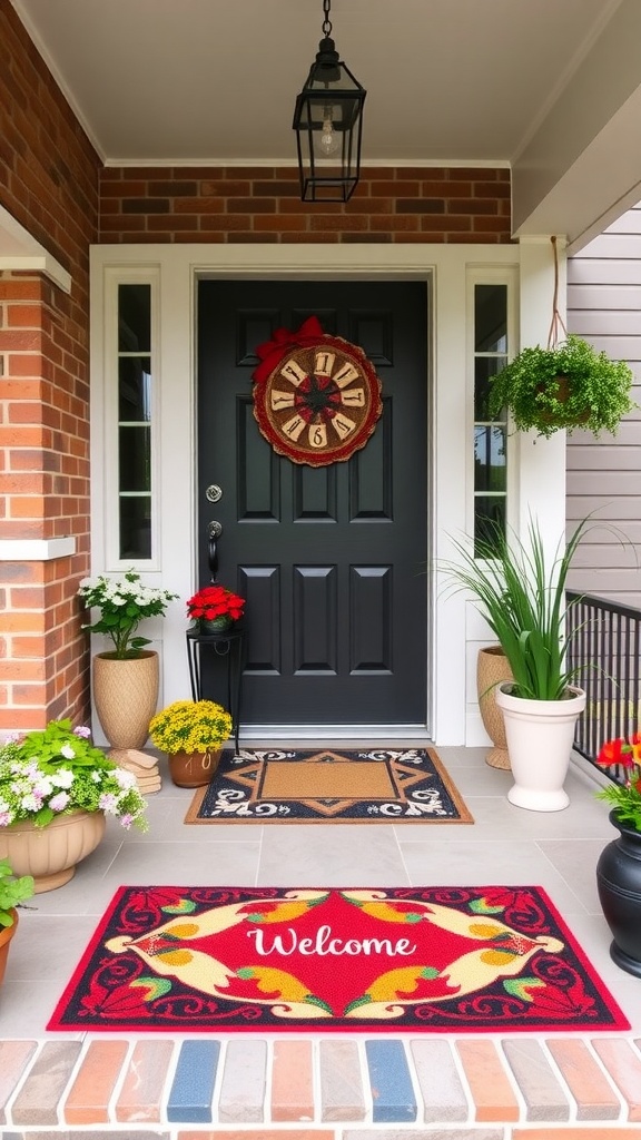 A front porch sets the tone for your home, and a stylish rug can make a big difference. The image shows a charming entryway complete with a colorful welcome mat, inviting everyone who arrives. The rug’s vibrant design adds character, making it a focal point that draws the eye.