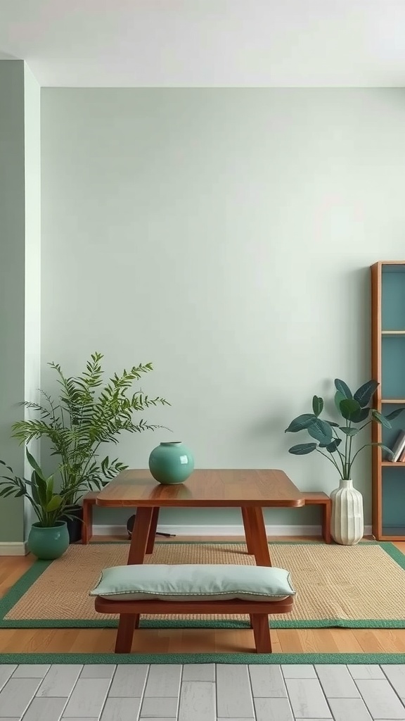 The image showcases soft, muted greens, which are perfect for creating a peaceful atmosphere. The gentle hues on the walls complement the wooden furniture. This color choice enhances the natural feel of the space.