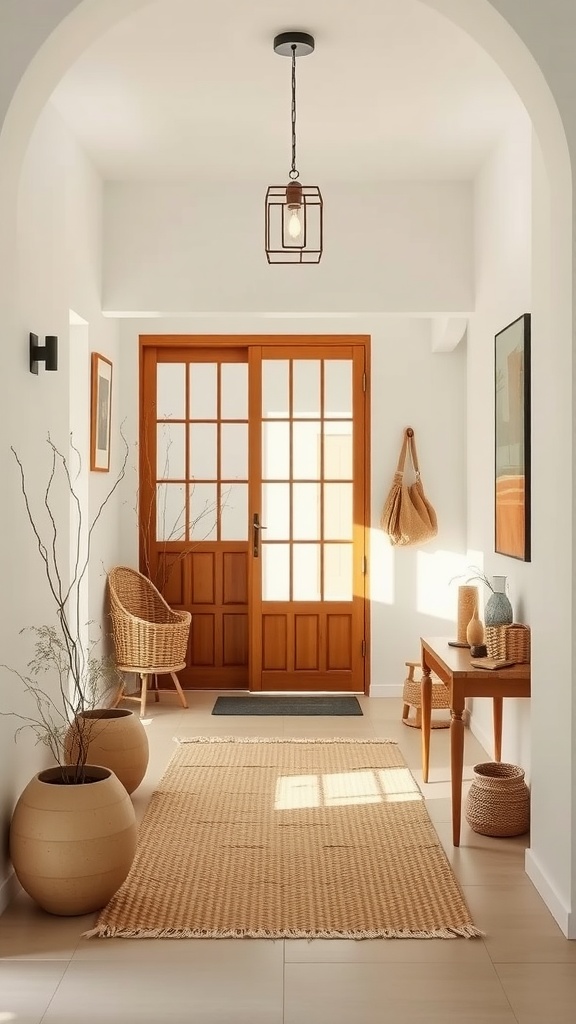 The wooden doors grab attention with their rich color, while the soft lighting from the pendant lamp adds a cozy touch. A simple rug on the floor not only adds texture but also makes the entryway feel grounded. The blend of functionality and beauty stands out in this serene setting.