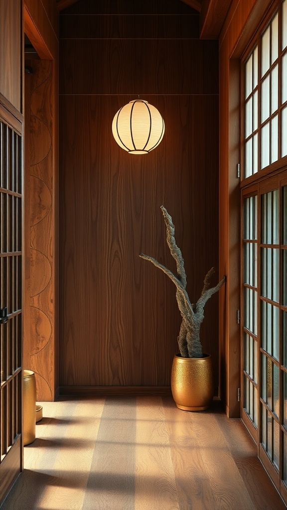 The soft lighting from the lantern enhances the wood’s natural tones, casting gentle shadows that bring the room to life. This combination creates a calming atmosphere, ideal for relaxation and mindfulness.