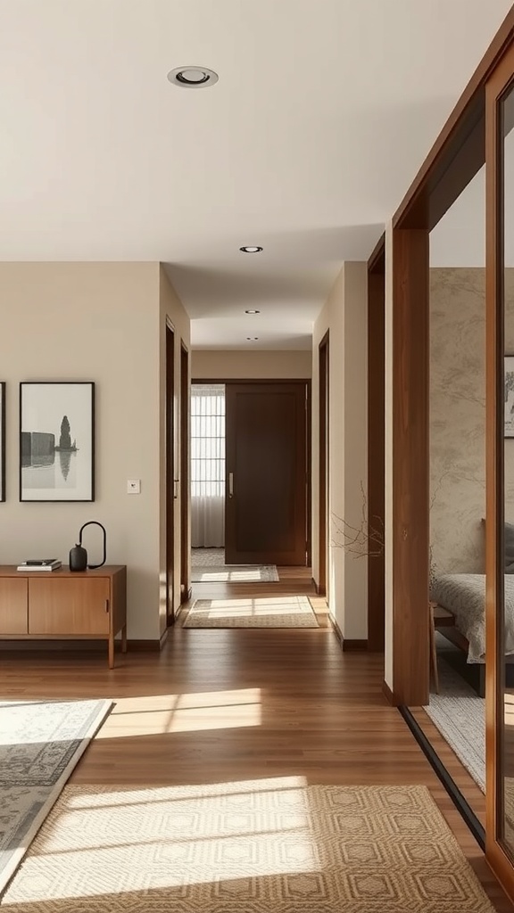 On one side, a simple yet elegant console table holds a stylish lamp, adding a touch of modernity. The use of natural materials, like wood and soft textiles, makes the space feel both inviting and uncluttered. The open doors lead to various areas, emphasizing the interconnectedness typical of Japandi design.