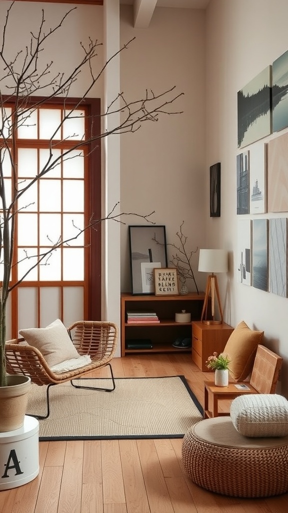 The tall branch in the corner adds a touch of nature, reflecting both cultures’ appreciation for organic elements. The soft furnishings, like the cozy chair and plush cushions, invite relaxation without cluttering the room.