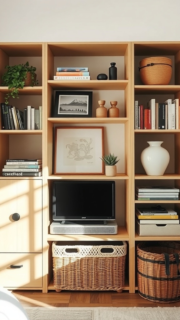 The image showcases a beautifully designed shelving unit that captures this essence. Notice how the wood tone adds warmth while maintaining a clean look. Each shelf is thoughtfully arranged with books, plants, and decorative items that enhance the aesthetic.