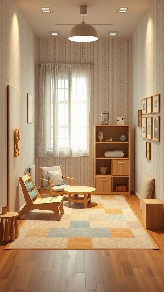 The furniture choices are both stylish and practical. The low chair and round table are perfect for little ones, providing a comfortable area for activities. The soft rug adds warmth and safety, making it ideal for children to sit and play.