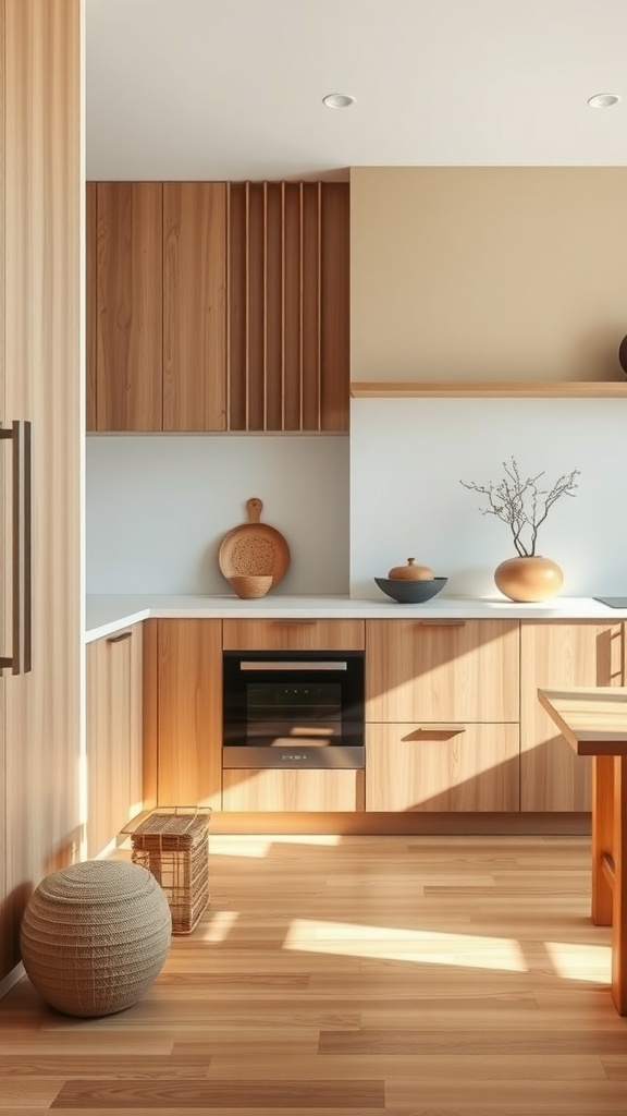 The layout is practical, allowing for smooth movement and easy access to essential appliances. The neutral color palette, highlighted by the soft wood tones, contributes to a calm and inviting atmosphere. Natural elements like the woven basket and textured stool add charm without cluttering the space.