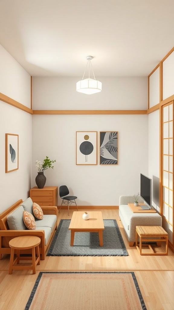 Furniture choices are key in Japandi design. Here, you can see a sleek sofa paired with a wooden coffee table, promoting a relaxed atmosphere. Each piece is carefully selected for both style and usability, ensuring that the space remains clutter-free while still feeling lived-in.