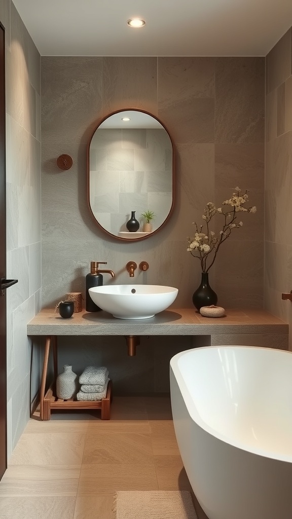 The plants bring a touch of nature indoors, enhancing the serene vibe. Gentle lighting from the fixtures highlights the smooth textures, making it feel warm and inviting. Each element is carefully chosen to make the bathroom a rejuvenating oasis.