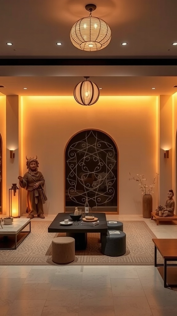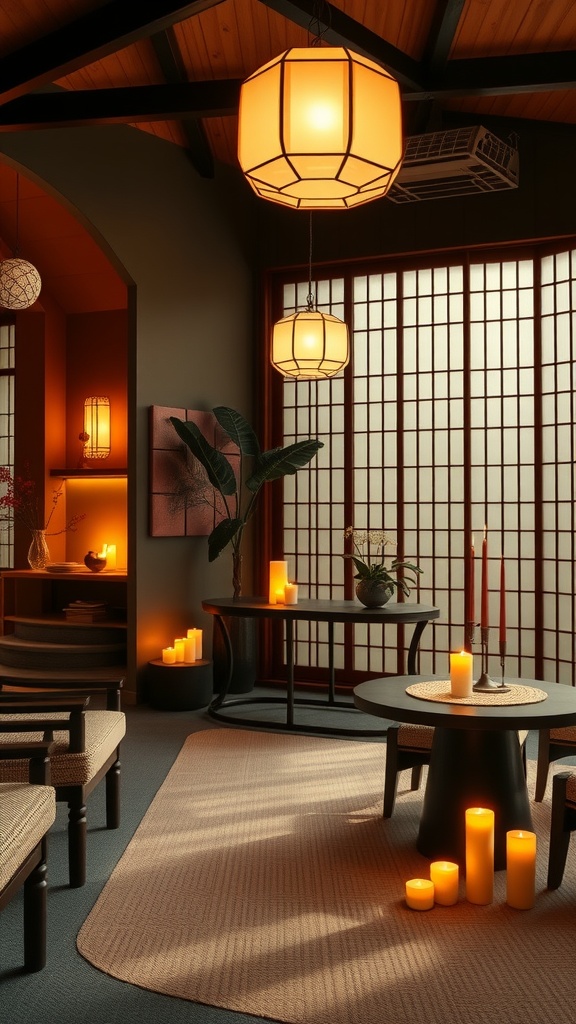 The use of multiple light fixtures adds depth to the space. It highlights the beautiful textures of the walls and floors while casting soft shadows that enhance the overall design. The lantern-style lights blend traditional and modern aesthetics, a hallmark of Japandi style.