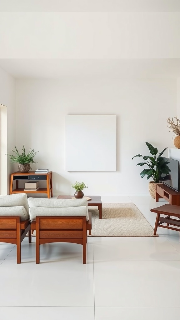 A minimalist aesthetic is evident with simple, clean lines and a neutral color palette. The artwork on the wall adds a touch of sophistication, while the plants introduce a hint of life and freshness to the room.