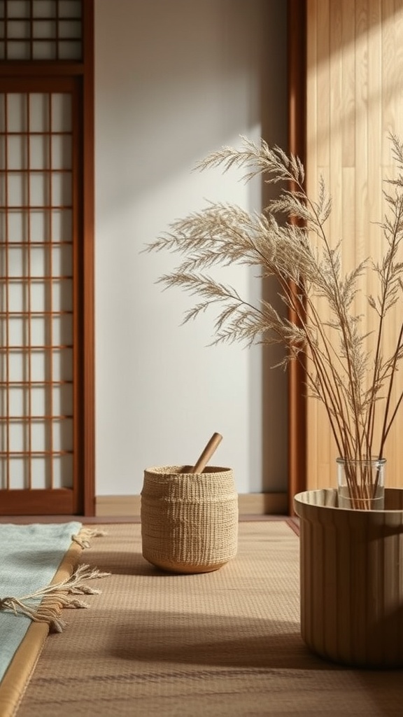 The woven basket and the delicate plant add a touch of nature, enhancing the connection to the outdoors. Such elements are essential in Japandi design, where simplicity meets organic beauty. Each piece contributes to a harmonious aesthetic that is both functional and beautiful.