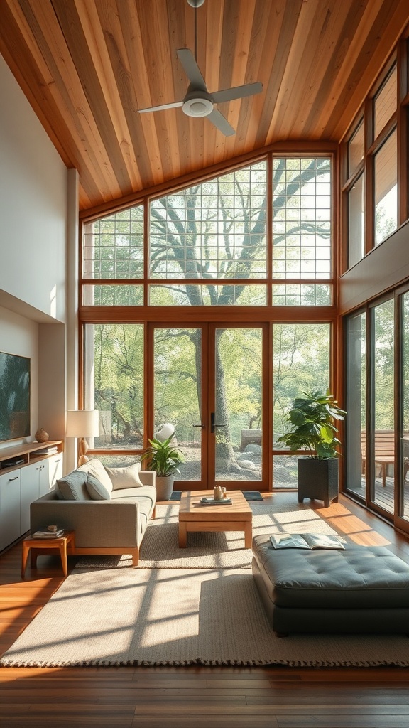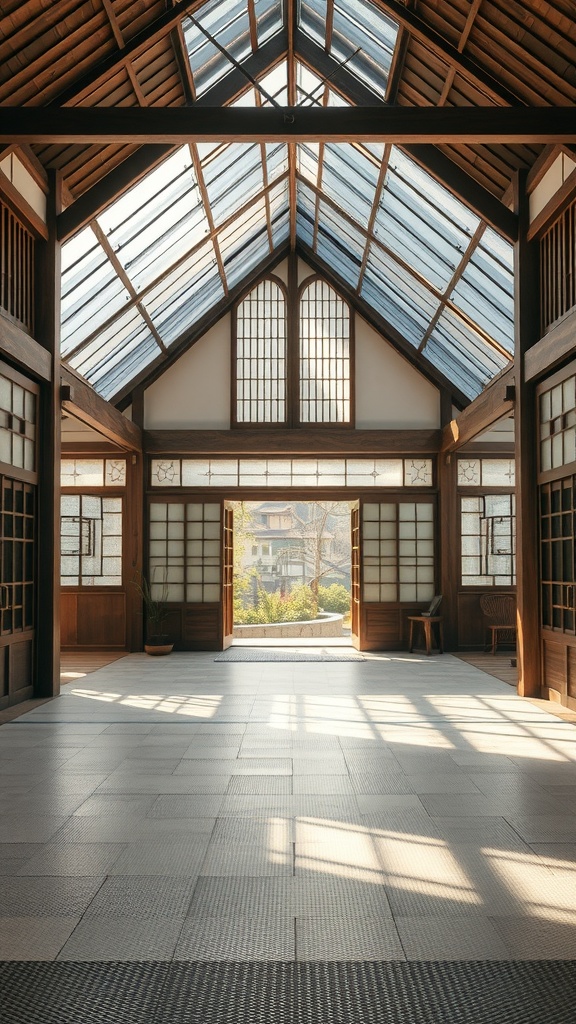 Japandi interiors thrive on open, airy spaces that invite natural light and create a sense of serenity. The image showcases a stunning interior with expansive glass windows and a high ceiling, allowing sunlight to flood the room. This design choice not only enhances the aesthetic but also promotes a feeling of spaciousness.