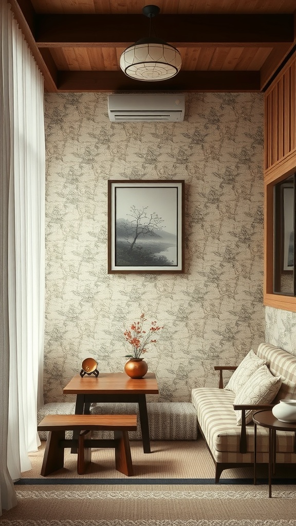Japandi interiors shine when it comes to mixing patterns in a gentle way. The image shows a cozy corner that perfectly captures this essence. The wall has a lovely, soft pattern that adds character without overwhelming the space.