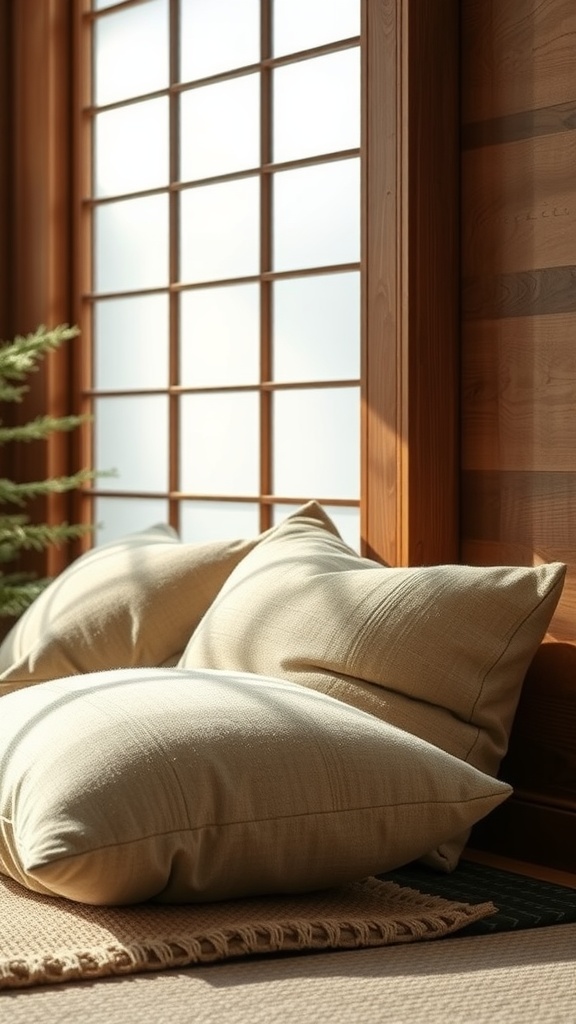 Textural contrast is a key element in Japandi interiors. The image showcases large, soft pillows resting against a wooden wall, creating a cozy feel. The pillows’ fabric adds warmth, contrasting nicely with the smooth wood.