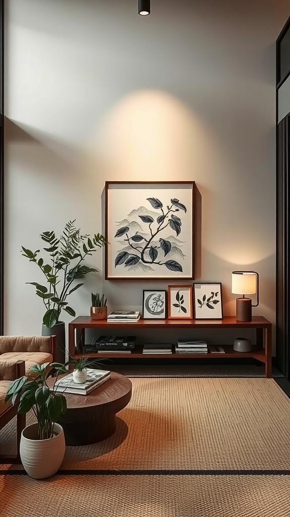 Details like the framed artwork and decorative vase bring a touch of personality to the area. Together, these elements create a space that feels both modern and traditional, which is at the heart of Japandi style.