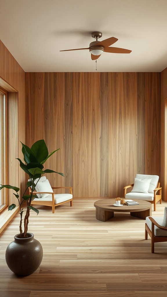 Japandi interiors blend Japanese minimalism with Scandinavian functionality. The image showcases a serene space that reflects this harmonious mix. The warm wood tones on the walls create a cozy atmosphere, while the clean lines of the furniture promote simplicity and comfort.