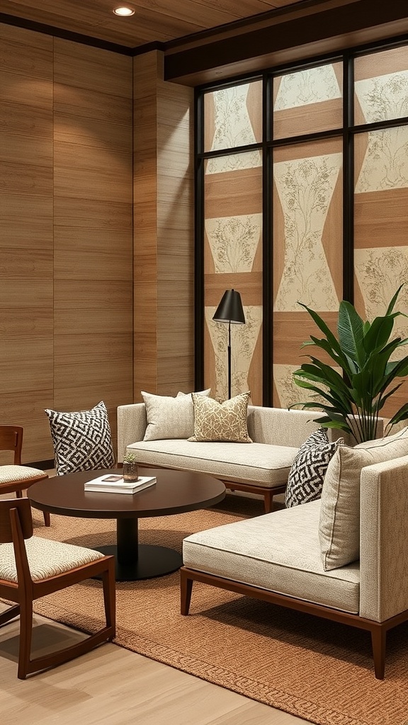 The seating area features comfortable chairs with soft cushions, inviting relaxation. The round coffee table adds an organic touch, enhancing the room’s natural vibe. A potted plant introduces a splash of greenery, bringing life to the otherwise muted palette.