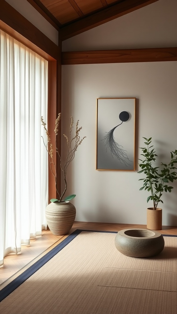 The image beautifully captures the essence of Japandi interiors, showcasing a serene space that invites calmness. Soft natural light filters through sheer curtains, creating a warm and welcoming atmosphere.