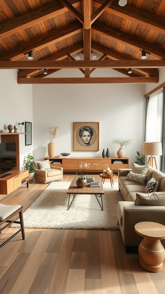 Wood accents can truly bring a room to life. In a large living room, they create a cozy and inviting atmosphere. The image shows a bright space dominated by beautiful wooden beams on the ceiling. These beams not only add height but also warmth, making the room feel welcoming.