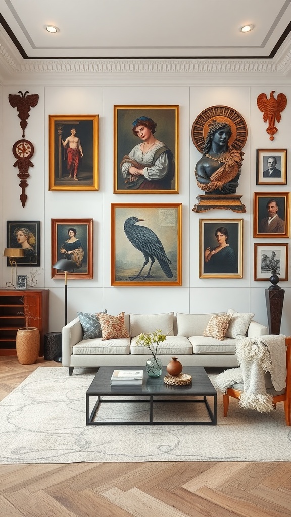 Transforming a large living room into a cozy yet stylish space can be as simple as focusing on wall decor. The image here presents a beautiful example of this idea. A mix of classic paintings adorns the wall, showcasing various styles and subjects that draw the eye. Each piece adds character and story to the room, making it feel more inviting.