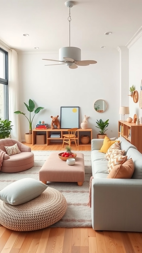Creating a child-friendly living room is all about balancing style and safety. The image shows a spacious living room that embraces both comfort and playfulness. Soft, rounded furniture like the pink chair and pouf invites kids to relax and play without worrying about sharp edges.