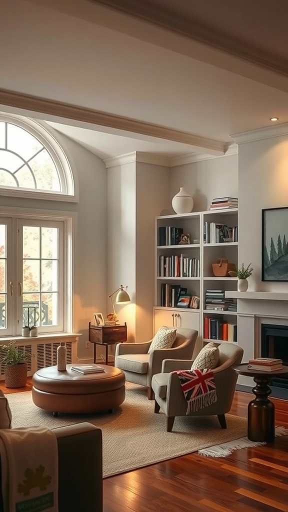 Imagine settling into a comfy chair, surrounded by the soft glow of warm lights and the scent of books. This living room perfectly captures that cozy reading nook vibe. A plush armchair beckons you to curl up with your favorite novel, while the nearby bookshelf is filled with countless stories waiting to be discovered.