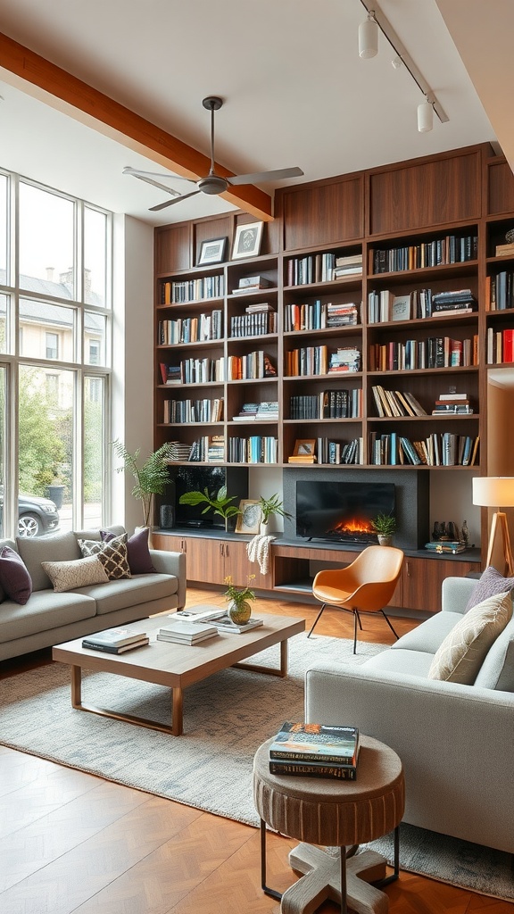 Creating a gallery for books in your living room adds character and a personal touch. The image shows a spacious and inviting space filled with natural light. A large bookshelf dominates one wall, showcasing a colorful array of books.