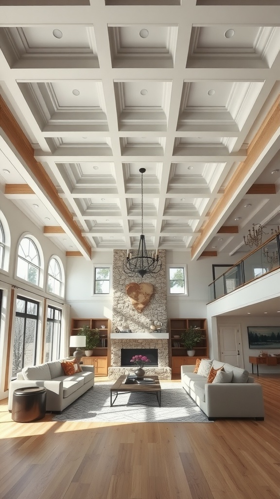This ceiling design features a grid pattern that adds depth and character. The clean lines and soft tones make the room feel open and inviting. Such designs can make your large living room seem even more spacious by playing with light and shadows.