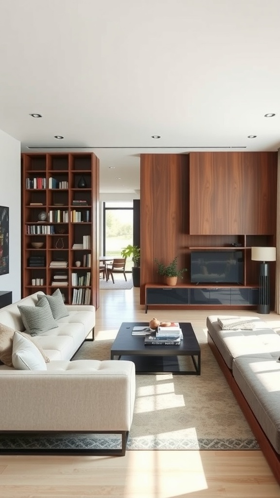 When it comes to large living rooms, finding ways to divide the space can be a fun challenge. Room dividers can create cozy corners and distinct areas without the need for permanent walls. In the image, a stylish layout showcases a functional living room with a couch, coffee table, and a large bookshelf. The furniture arrangement invites relaxation and conversation, while the bookshelf doubles as a divider.