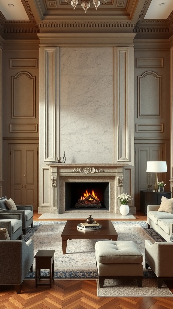 The surrounding furniture complements the fireplace perfectly. Soft sofas and a simple coffee table invite relaxation. The color palette is soothing, with neutral tones that enhance the elegant feel of the space.
